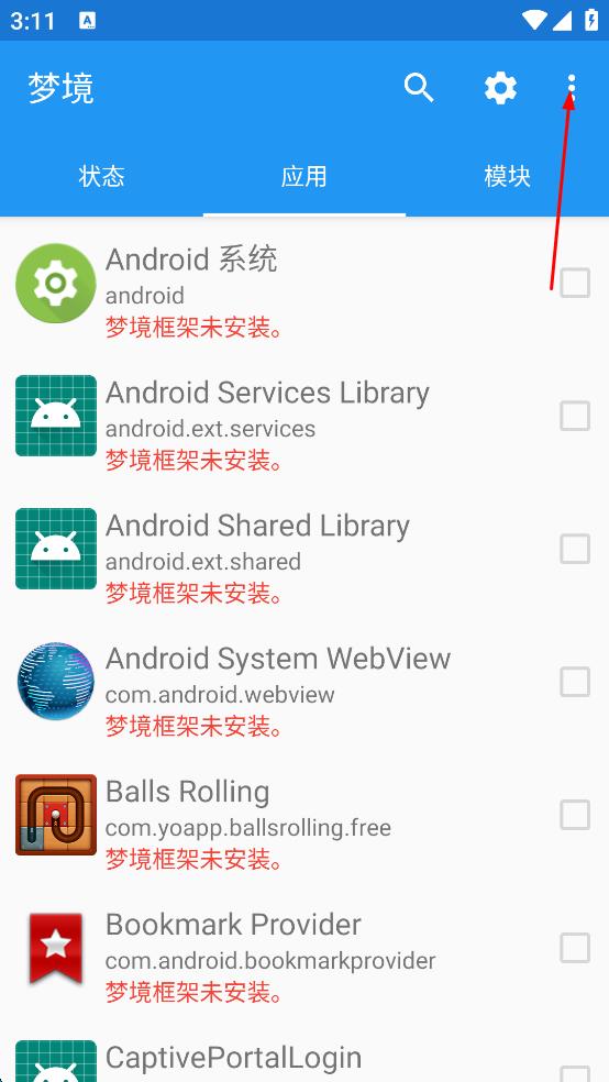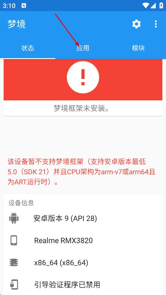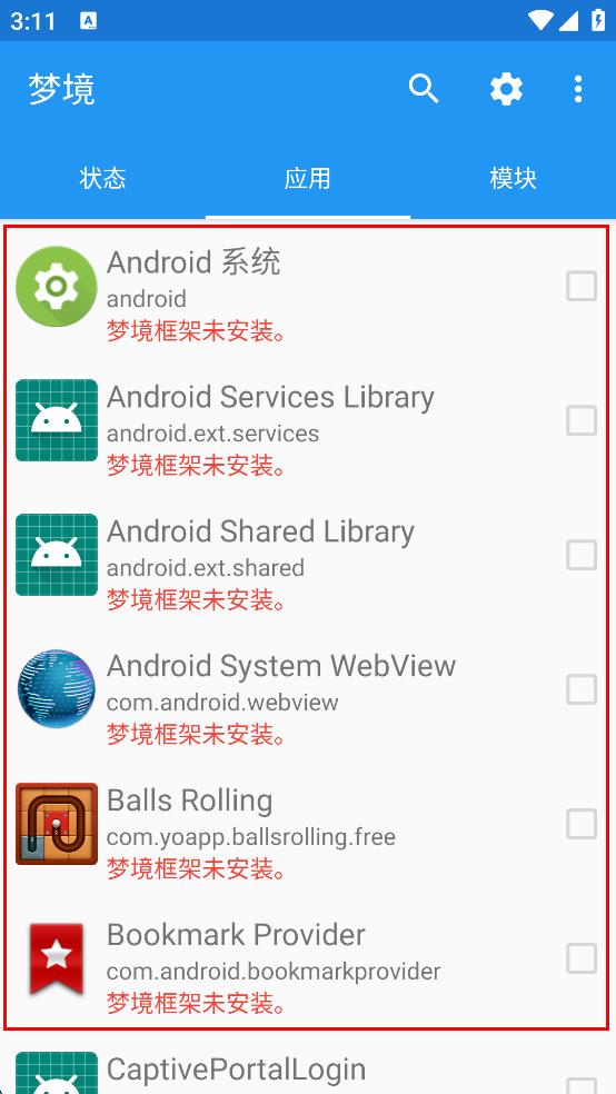 2、在應(yīng)用頁面,可看到多個應(yīng)用顯示“夢境框架未安裝”,了解應(yīng)用與框架的關(guān)聯(lián)情況。