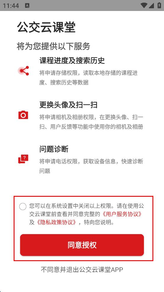 1、打開(kāi)公交云課堂APP,在權(quán)限說(shuō)明頁(yè)面,點(diǎn)擊“同意授權(quán)”按鈕。