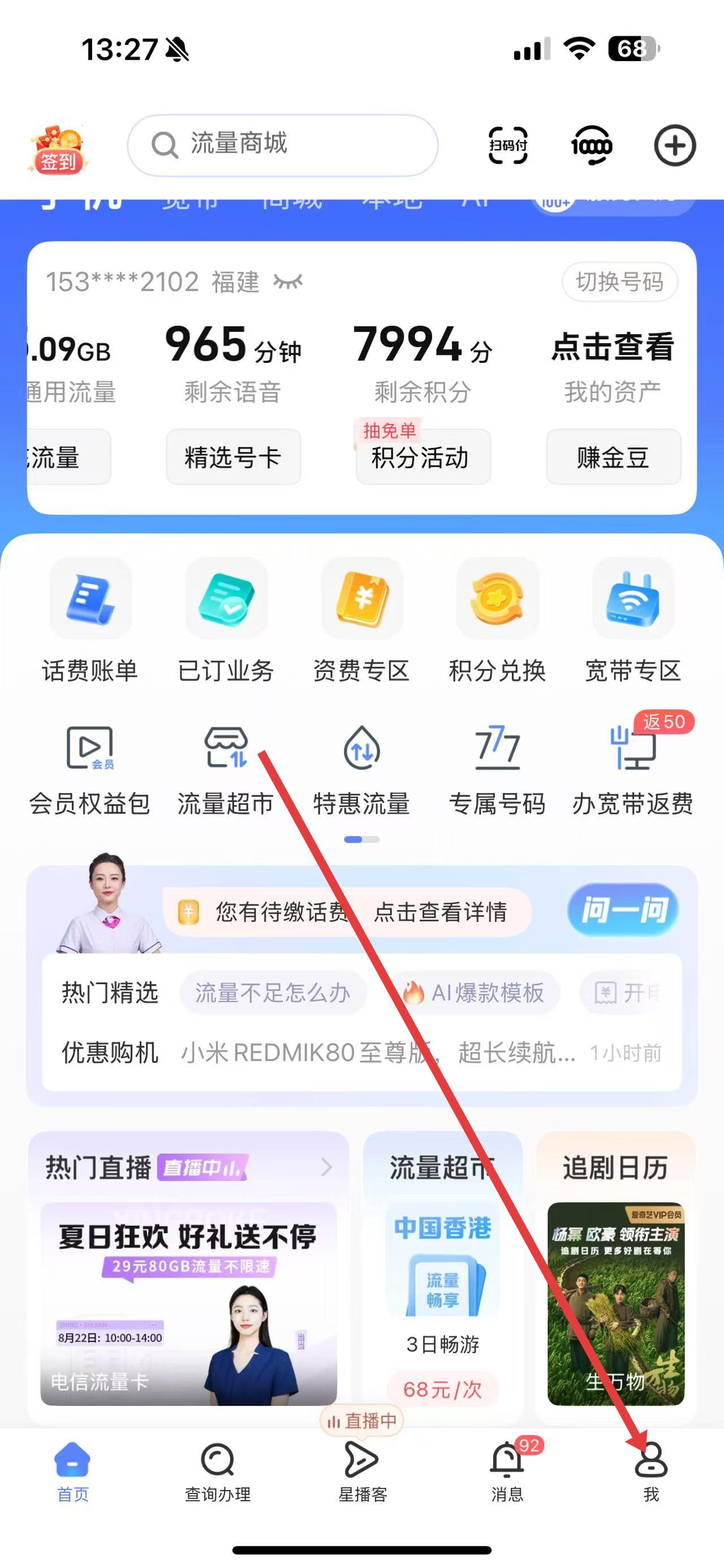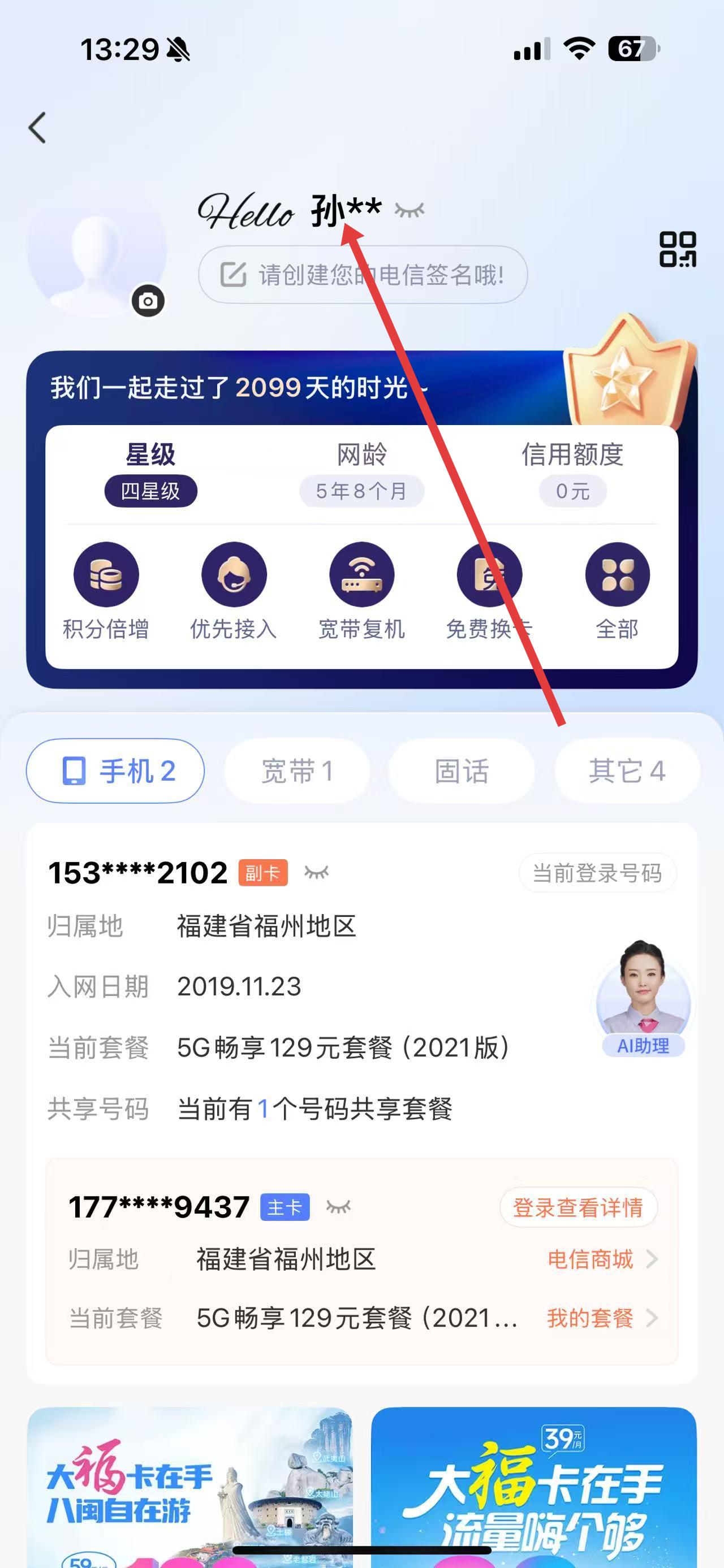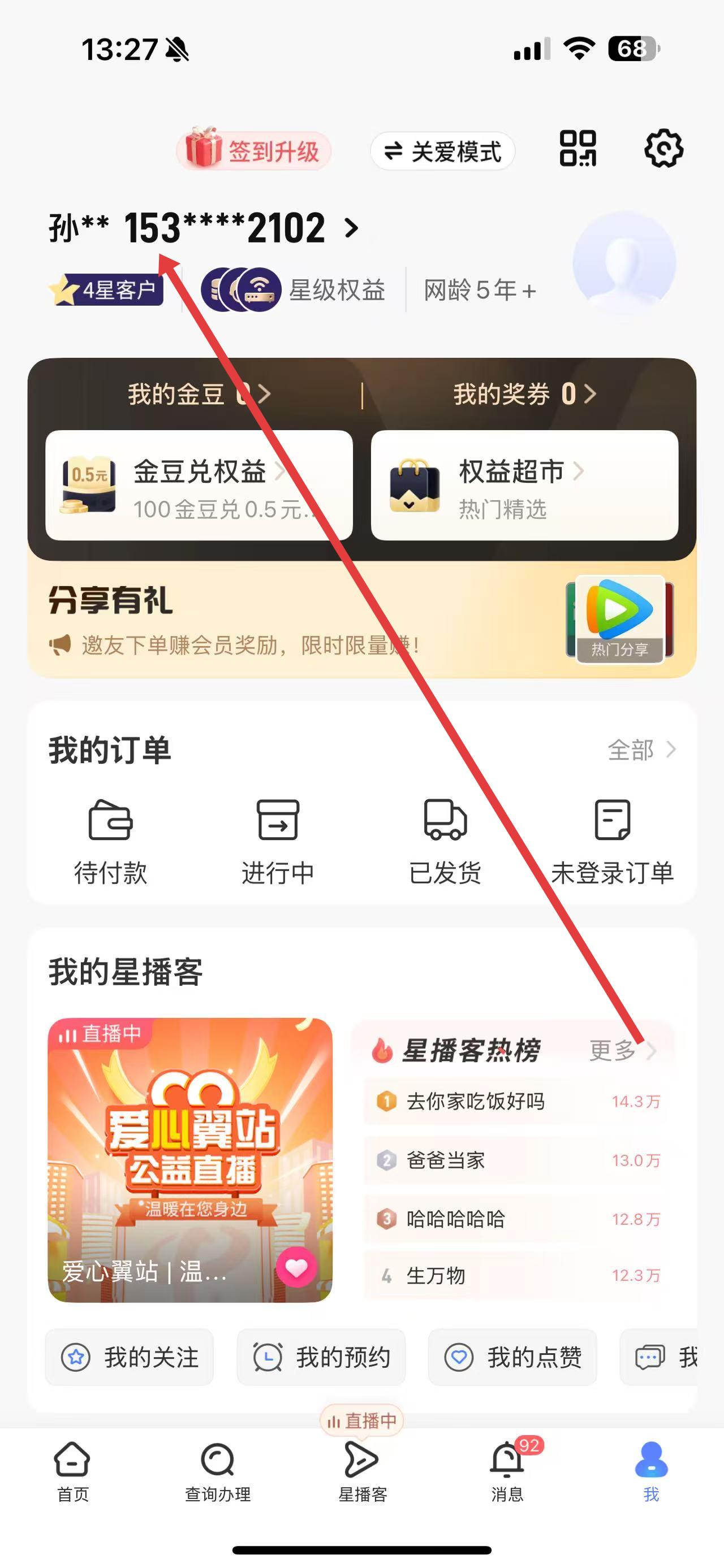 2、在個(gè)人中心界面,點(diǎn)擊上方自己的手機(jī)號(hào),進(jìn)入號(hào)碼詳情頁(yè)面。