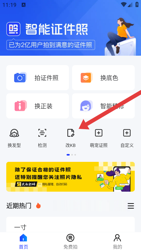 1、在智能證件照首頁,點(diǎn)擊功能欄中的改KB選項(xiàng),進(jìn)入圖片選擇界面。