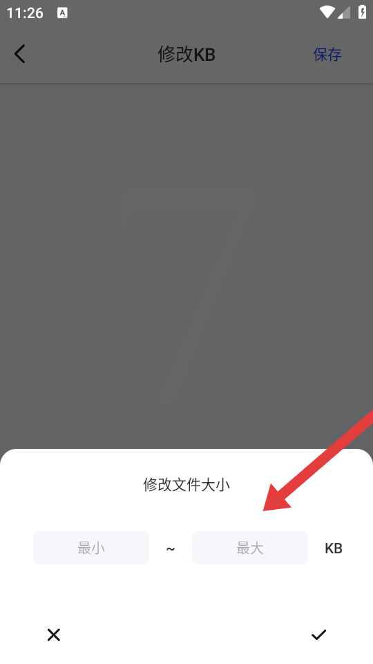 4、在大小設(shè)置彈窗中,輸入KB數(shù)值范圍后,點(diǎn)擊右下角確認(rèn),完成像素大小修改。