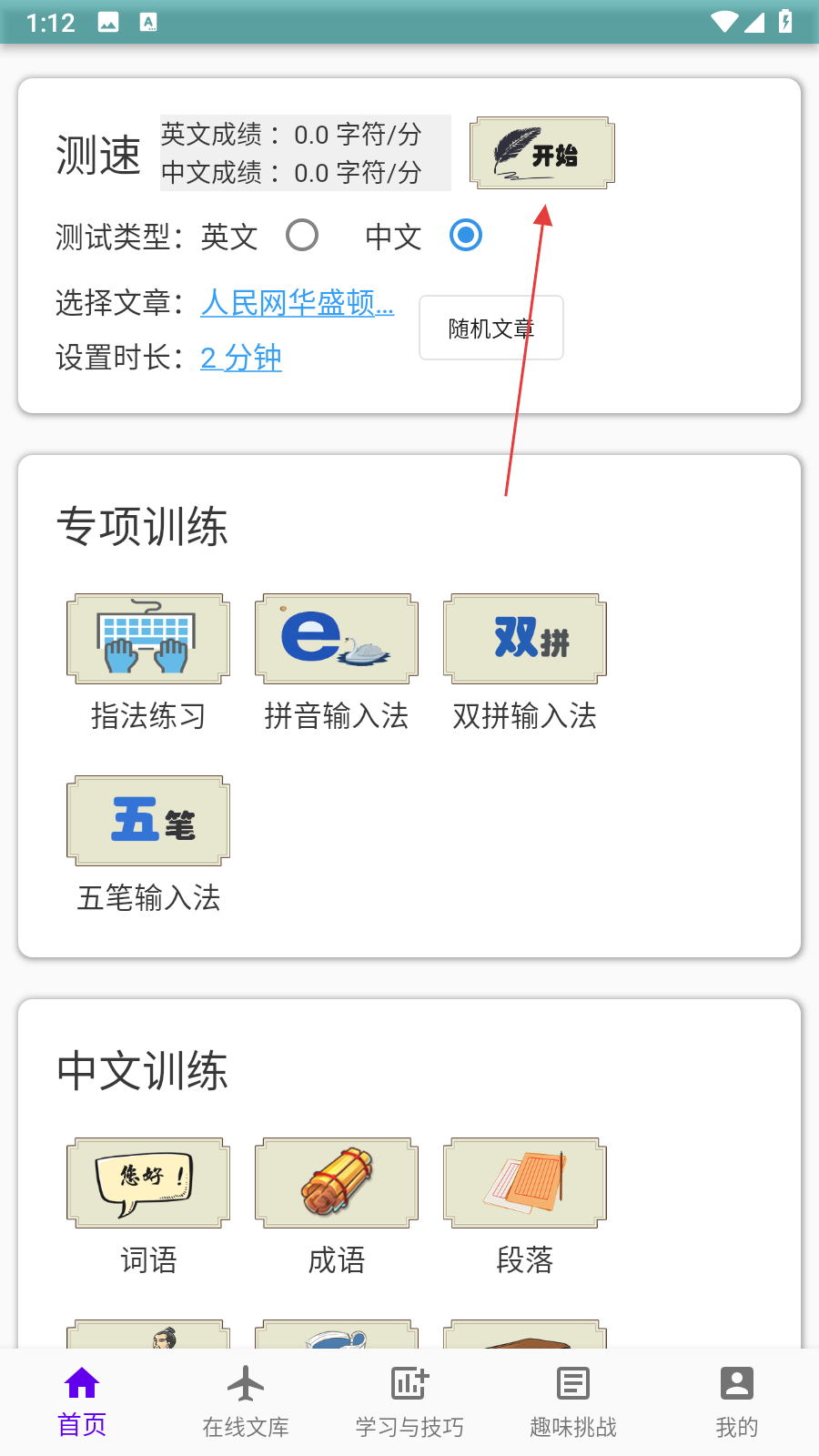 1、打開只語打字訓(xùn)練軟件,在首頁測速區(qū)域選擇測試類型、文章以及設(shè)置時長,然后點(diǎn)擊開始按鈕。