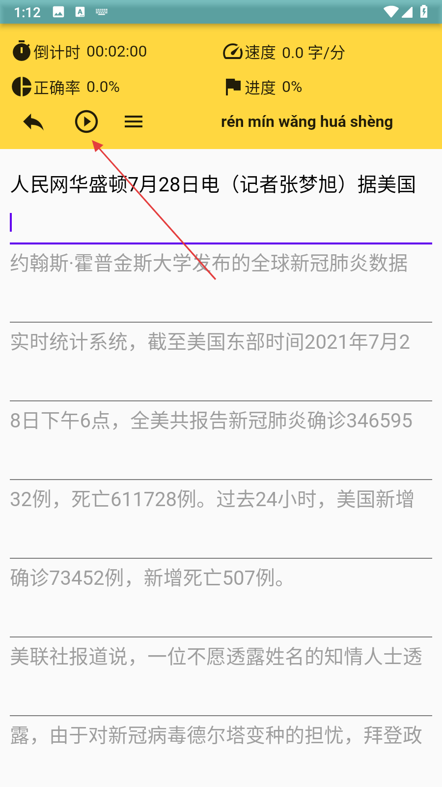 2、進(jìn)入打字練習(xí)界面后,點(diǎn)擊播放按鈕,開始跟隨屏幕顯示的文章內(nèi)容進(jìn)行打字輸入。