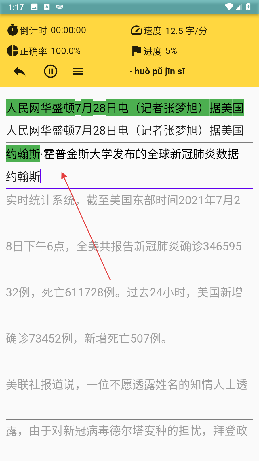 3、在打字過程中,系統(tǒng)會對已輸入的正確內(nèi)容進(jìn)行綠色標(biāo)識。