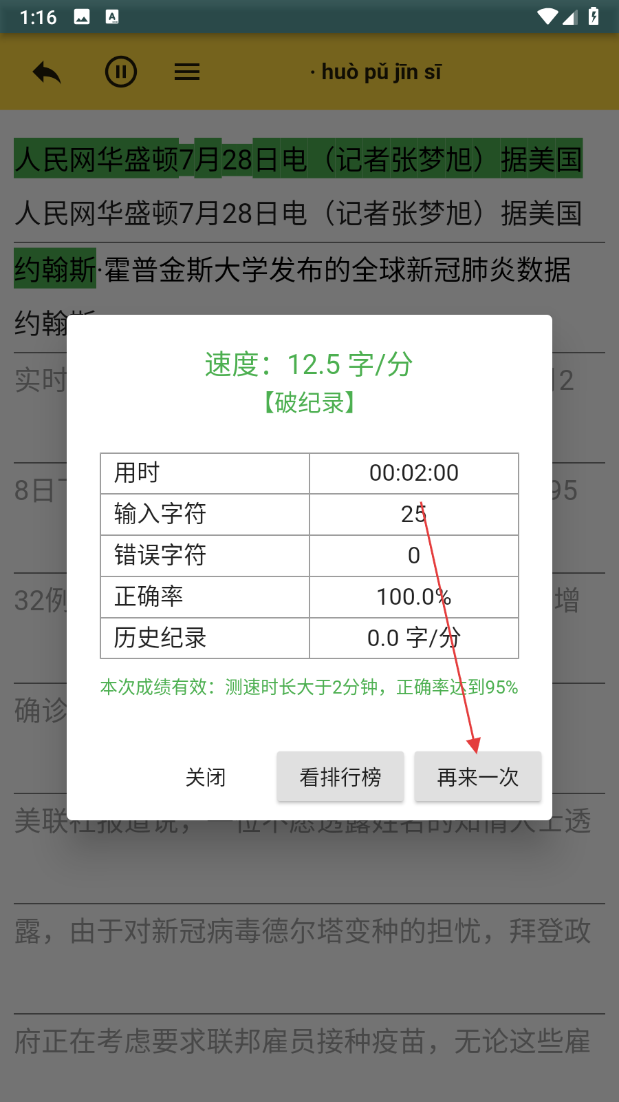 4、打字練習(xí)結(jié)束后,會彈出成績統(tǒng)計(jì)彈窗,可根據(jù)需求點(diǎn)擊再來一次繼續(xù)練習(xí)。