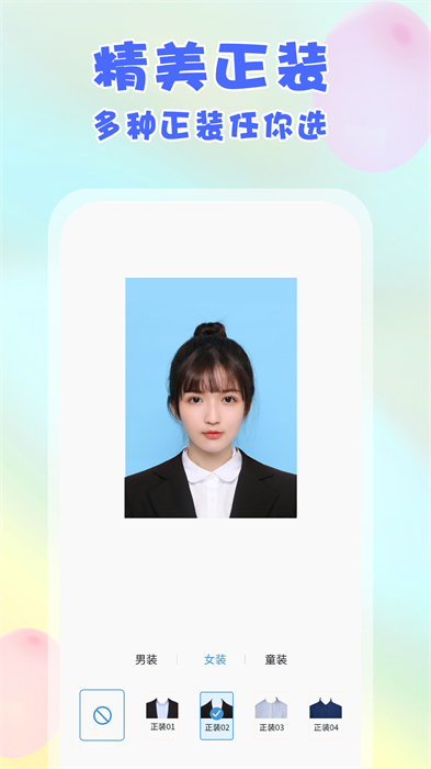 女裝、男裝、童裝等多套正裝模板,可供您任意選擇,智能貼合人像,秒換正裝,讓您的證件照看起來更專業(yè)。