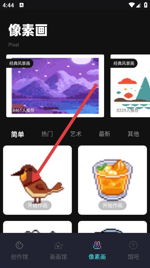 2、挑選想要繪制的圖案,點(diǎn)擊開始作畫,完成像素畫的繪制。