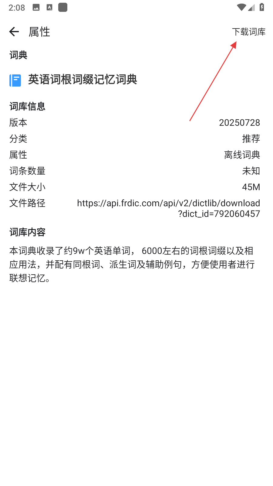 4、在目標(biāo)詞典的屬性詳情頁面,點擊右上角下載詞庫按鈕。