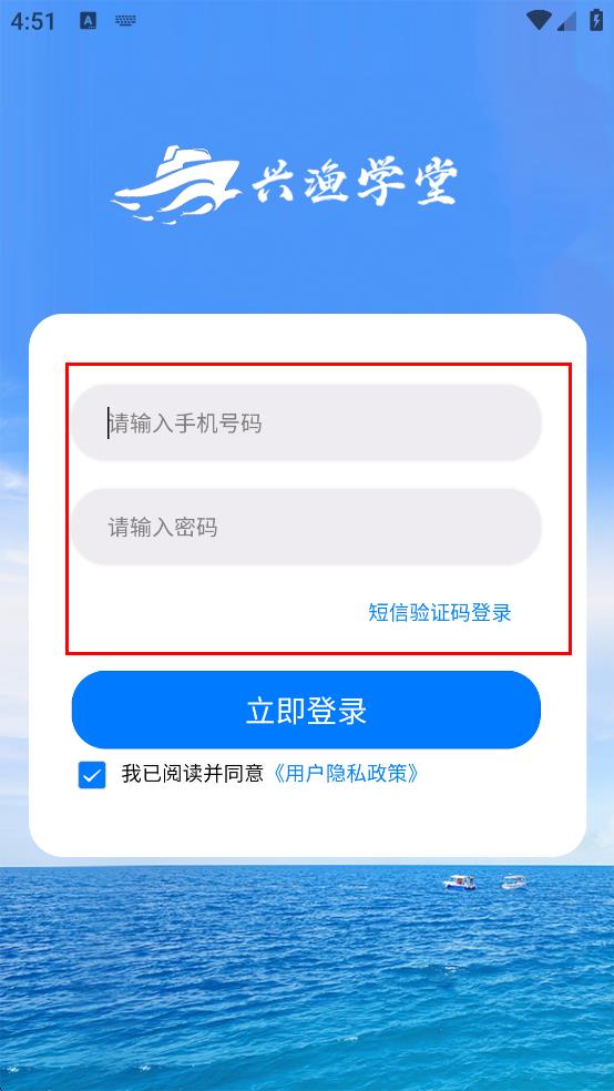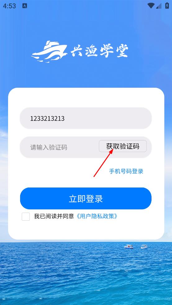 4、將收到的驗證碼輸入到對應(yīng)的驗證碼輸入框中,確認信息無誤后,點擊“立即登錄”按鈕,即可完成興漁學(xué)堂APP的登錄操作。