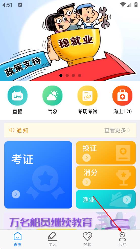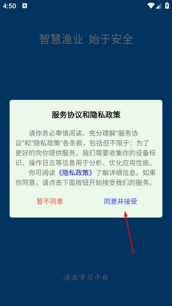 1、打開興漁學(xué)堂APP,在服務(wù)協(xié)議和隱私政策頁面,點擊“同意并接受”,進入APP主界面后,點擊右下角“我的”。
