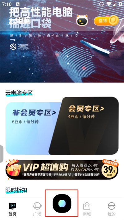 1、進入軟件點擊下方的方框按鈕,直接進入到云電腦中,注意為了能夠正常使用需要先注冊登錄哦;
