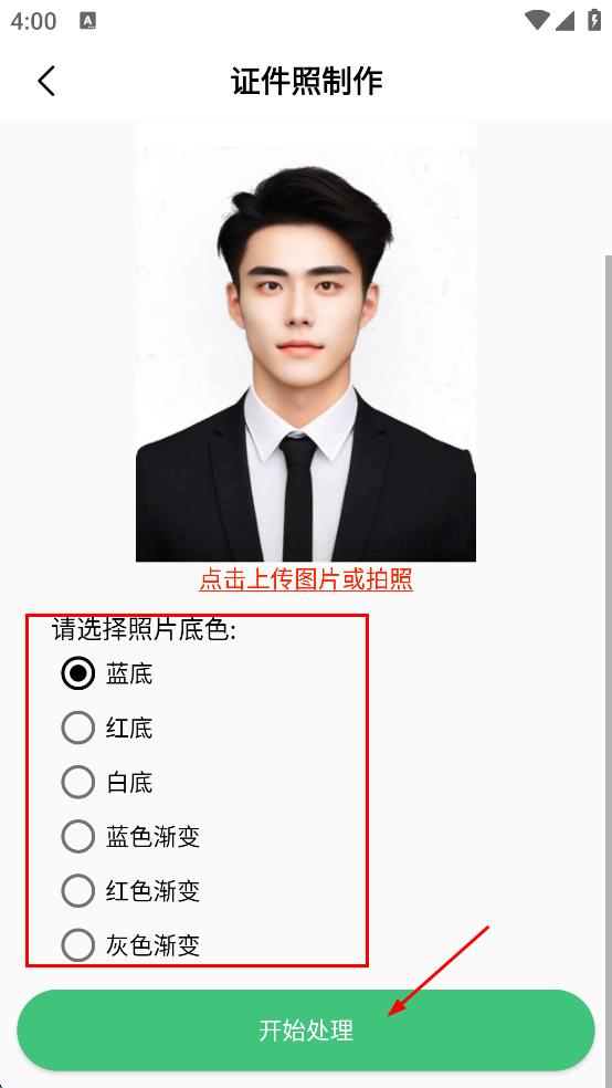 4、在證件照制作頁面,選擇照片底色,如藍(lán)底、紅底等,然后點擊“開始處理”,等待軟件完成證件照制作。