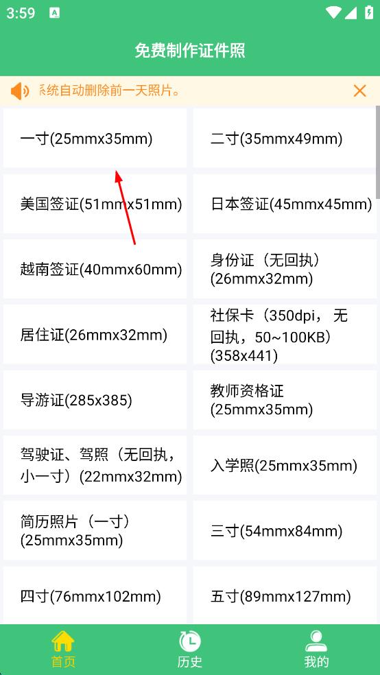 2、在軟件主界面,選擇所需的證件照尺寸,比如點擊一寸,進(jìn)入照片選擇頁面。
