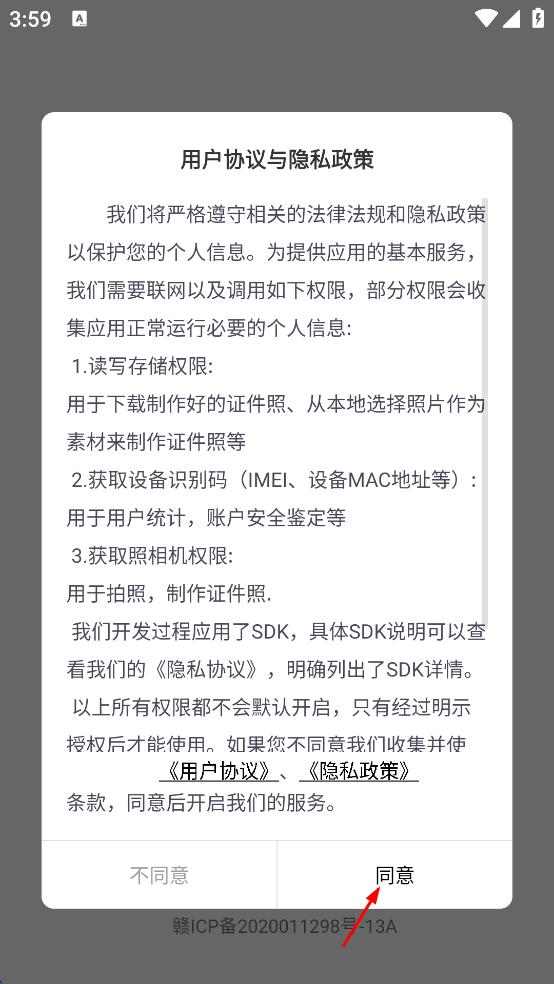 1、打開證件照制作軟件,在彈出的用戶協(xié)議與隱私政策提示框中,仔細(xì)閱讀相關(guān)內(nèi)容后,點擊“同意”,進(jìn)入軟件主界面。