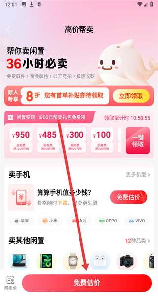 3、進入到高價幫賣頁面,可以點擊下方免費估價按鈕,進行估價商品進行售賣。