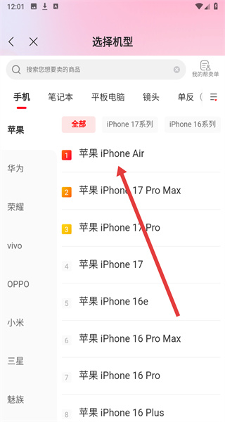 4、進入機型選擇頁面,可以點擊要出手的機型,進行估價售賣。