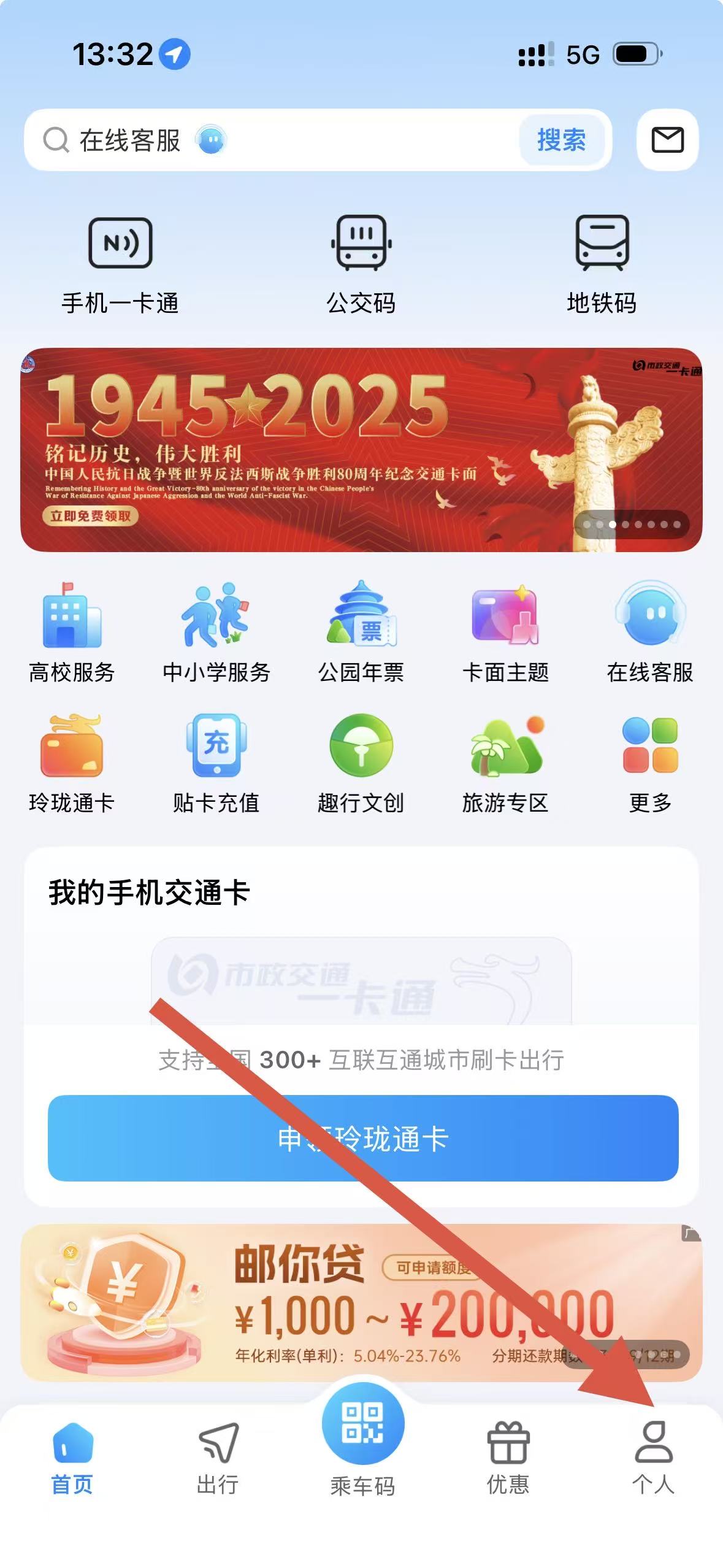 1、在北京一卡通App首頁,點擊下方個人選項進入個人頁面。