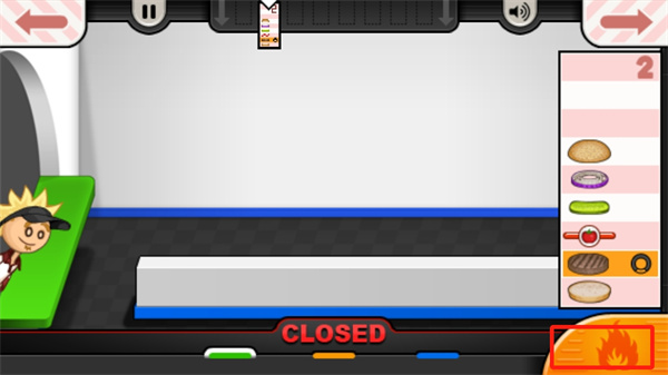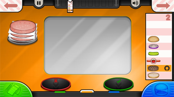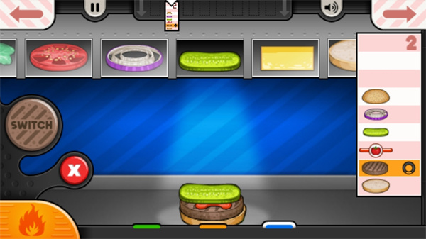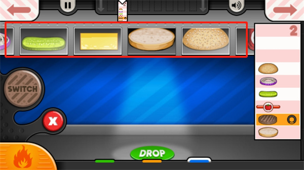 4、隨后我們點(diǎn)擊上圖藍(lán)色漢堡按鈕,就可以去進(jìn)行制作漢堡,按照漢堡的放置順序,從下到上去進(jìn)行放置;