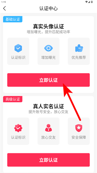 3、進(jìn)入認(rèn)證中心頁(yè)面后,點(diǎn)真實(shí)頭像認(rèn)證或真人實(shí)名認(rèn)證的立即認(rèn)證按鈕。