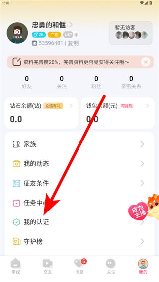 2、在個(gè)人頁(yè)面中,點(diǎn)擊我的認(rèn)證選項(xiàng)。