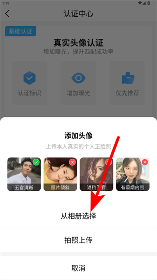 4、選擇從相冊(cè)選或拍照上傳本人真實(shí)正臉照,按照提示完成認(rèn)證操作即可。