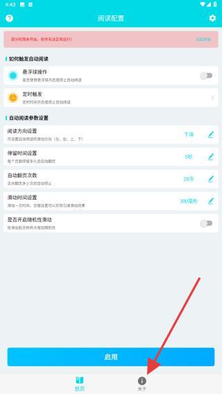 1、打開自動(dòng)閱讀助手APP,進(jìn)入閱讀配置頁面,點(diǎn)擊底部關(guān)于按鈕,跳轉(zhuǎn)至登錄引導(dǎo)界面。