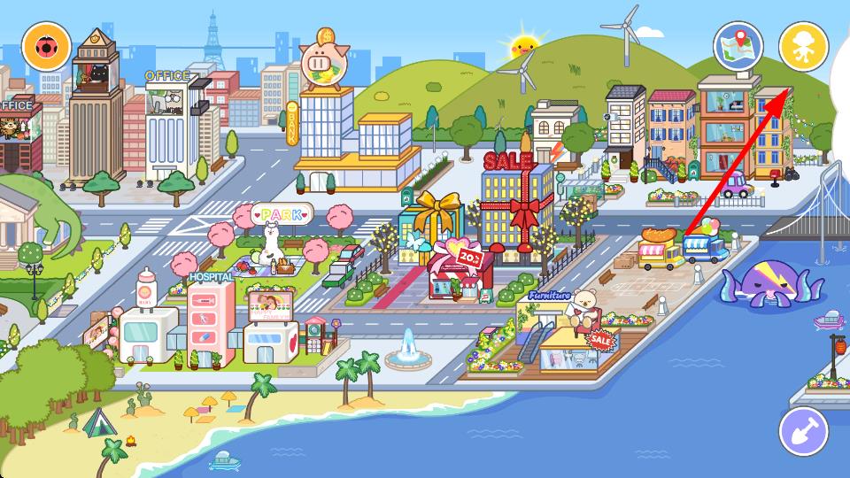 1、進入米加小鎮(zhèn)游戲主界面后,點擊右上角區(qū)域箭頭所指位置的相應(yīng)圖標(biāo),進入角色選擇或創(chuàng)建入口。