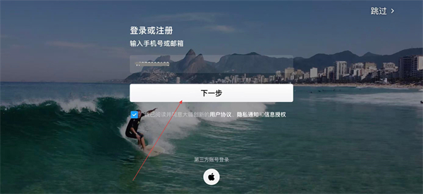 1.打開DJI Fly應(yīng)用,在登錄或注冊界面輸入手機(jī)號(hào)或郵箱,點(diǎn)擊下一步。
