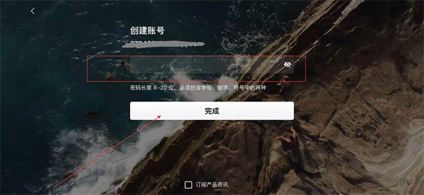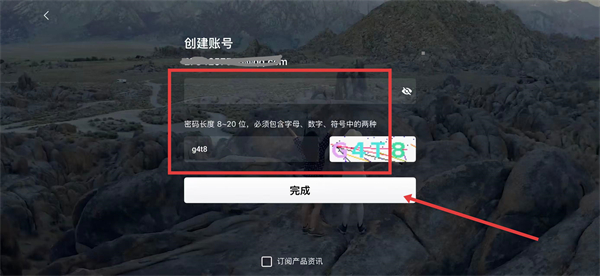 3.設(shè)置密碼長度8-20位,必須包含字母、數(shù)字、符號(hào)中的兩種,輸入驗(yàn)證碼后點(diǎn)擊完成。