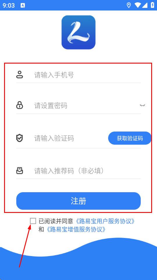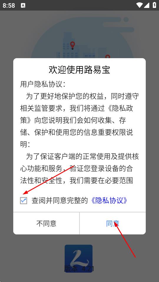 1、打開(kāi)路易寶APP,在彈出的歡迎使用路易寶頁(yè)面,勾選查閱并同意完整的隱私協(xié)議,點(diǎn)擊同意。