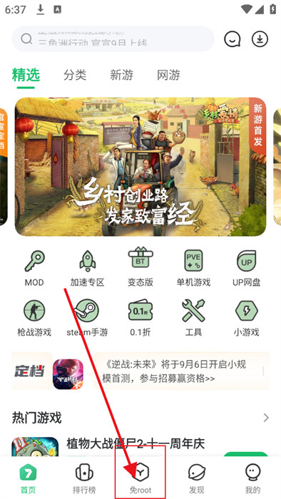 1、首先,你可以將軟件下載到手機(jī)桌面上,并點(diǎn)擊進(jìn)入到平臺(tái),點(diǎn)擊中間的【免root】,如下圖所示;