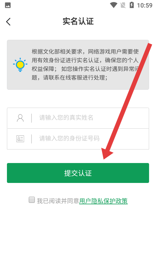3、在實(shí)名認(rèn)證頁面輸入真實(shí)姓名、身份證號(hào)碼,勾選我已閱讀并同意用戶隱私保護(hù)政策后,點(diǎn)擊提交認(rèn)證按鈕完成實(shí)名認(rèn)證。