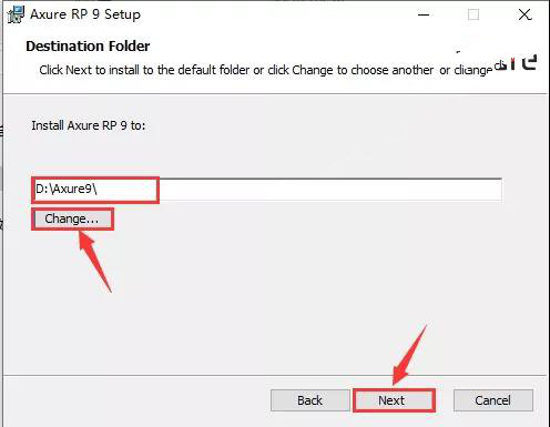 4、點(diǎn)擊【Change...】更改軟件的安裝路徑,建議安裝在除C盤之外的其它磁盤,可以在D盤或其它磁盤新建一個(gè)【Axure9】文件夾,然后點(diǎn)擊【Next】。