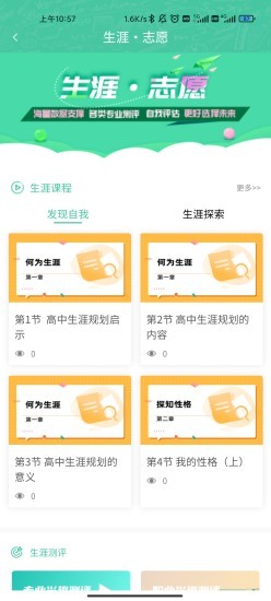 生涯志愿 高中階段是學生人生觀、價值觀、個性發(fā)展、自主發(fā)展的關鍵時期,也是學生生涯發(fā)展探索的準備期,系統(tǒng)提供了生涯課程,生涯測評,選科查詢等,幫助學生認識自我,發(fā)現(xiàn)自己的興趣、特長,明確自己的發(fā)展方向。模擬志愿,根據(jù)高考成績,智能分析匹配院校范圍及錄取概率