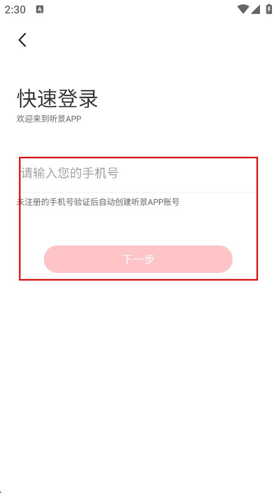 3、在快速登錄界面,輸入手機號碼,點擊“下一步”,按照提示完成后續(xù)驗證步驟,未注冊的手機號驗證后會自動創(chuàng)建該APP賬號,從而完成登錄。