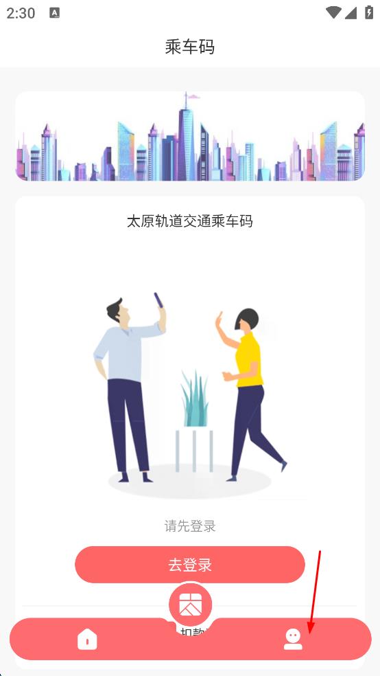 1、打開某交通APP,進入“乘車碼”頁面,看到“請先登錄”提示后,點擊頁面底部右側(cè)的個人中心圖標,進入個人中心頁面。