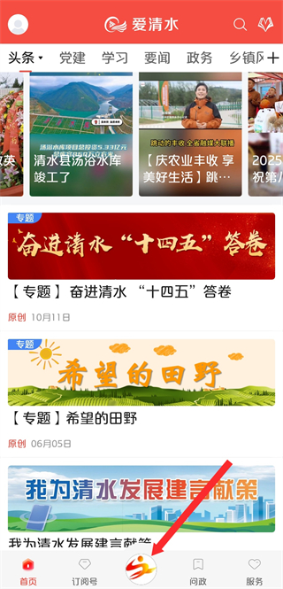 1、在首頁(yè)點(diǎn)擊底部中間功能入口,進(jìn)入新時(shí)代文明實(shí)踐云平臺(tái)頁(yè)面。