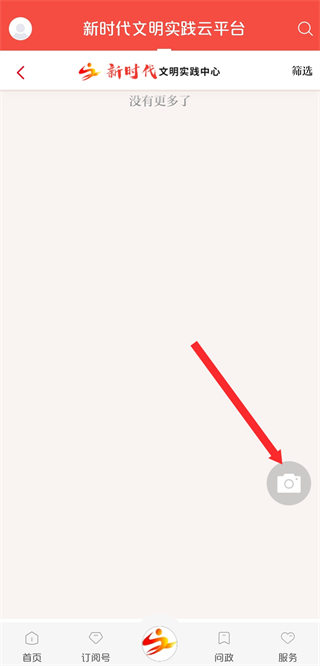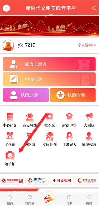 2、在新時(shí)代文明實(shí)踐云平臺(tái)頁(yè)面,點(diǎn)擊隨手拍功能入口,進(jìn)入隨手拍頁(yè)面。