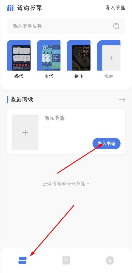 1、進入我的書架界面,查看頂部現(xiàn)代古代、都市分類及最近閱讀區(qū)域,點擊藍色導(dǎo)入書籍按鈕,啟動本地書籍導(dǎo)入流程。