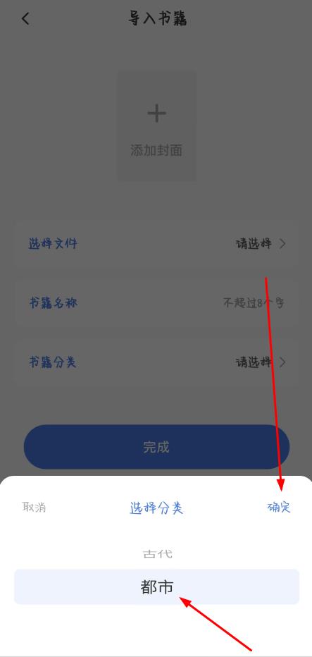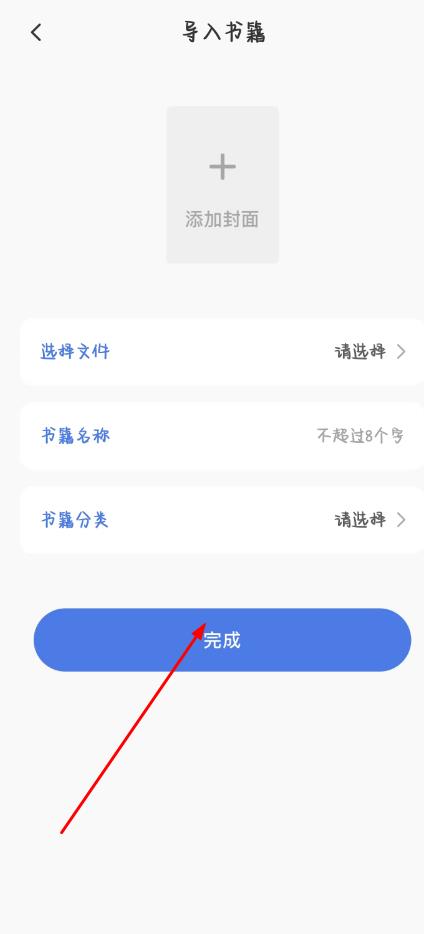 3、跳轉(zhuǎn)至導(dǎo)入書籍頁面,可通過添加封面完善展示,依次完成選擇文件填寫書籍名稱選擇書籍分類操作,點擊底部藍色完成按鈕提交信息。