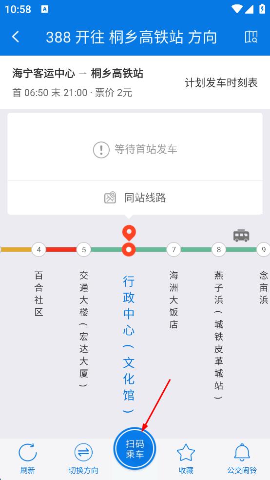 3、進入線路詳情頁后,點擊底部“掃碼乘車”按鈕,調(diào)出乘車碼,對準(zhǔn)公交掃碼設(shè)備掃描,完成乘車扣費。