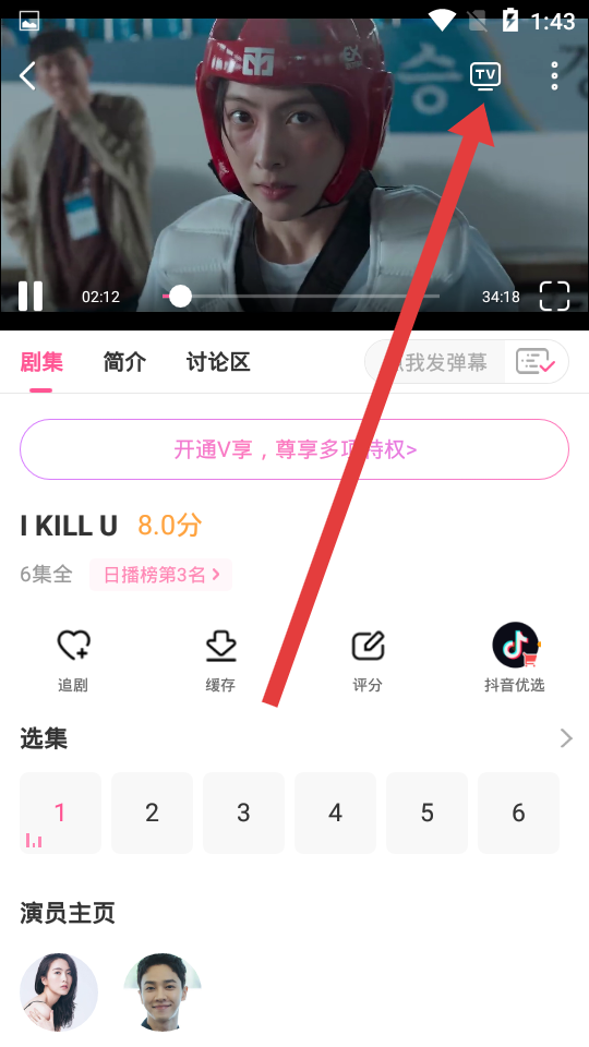 2、進(jìn)入視頻播放界面后,找到屏幕右上方的小電視TV投屏圖標(biāo),點(diǎn)擊進(jìn)入。