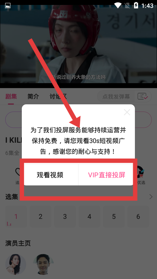 3、根據(jù)系統(tǒng)彈窗可以選擇觀看30s視頻完成投屏,或者通過(guò)充值VIP的方法投屏,然后選擇要投屏的電視設(shè)備即可。