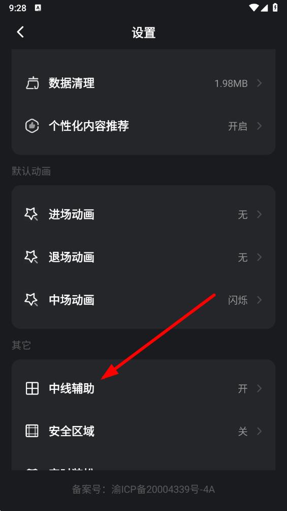 3、在設(shè)置界面里,找到并點擊中線輔助選項,進入中線輔助設(shè)置頁面。