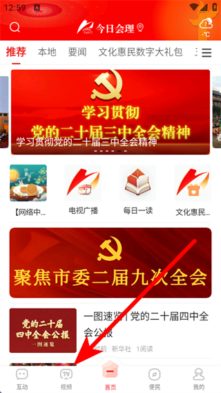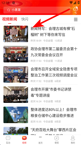 1、打開今日會理APP首頁,點擊底部視頻,進入視頻新聞頁面。
