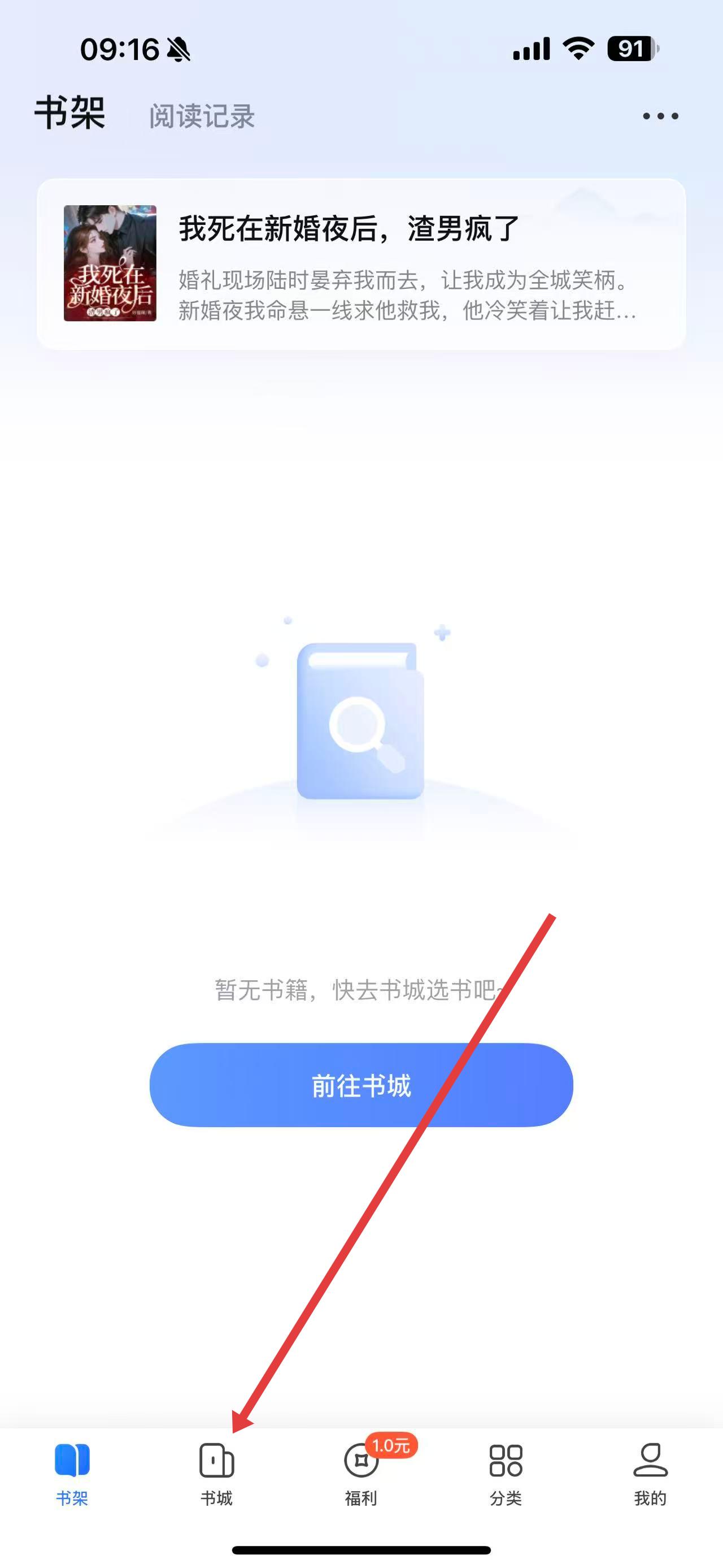 1、打開(kāi)江湖小說(shuō)免費(fèi)閱讀app,點(diǎn)擊底部導(dǎo)航欄中的書城進(jìn)入書城頁(yè)面。