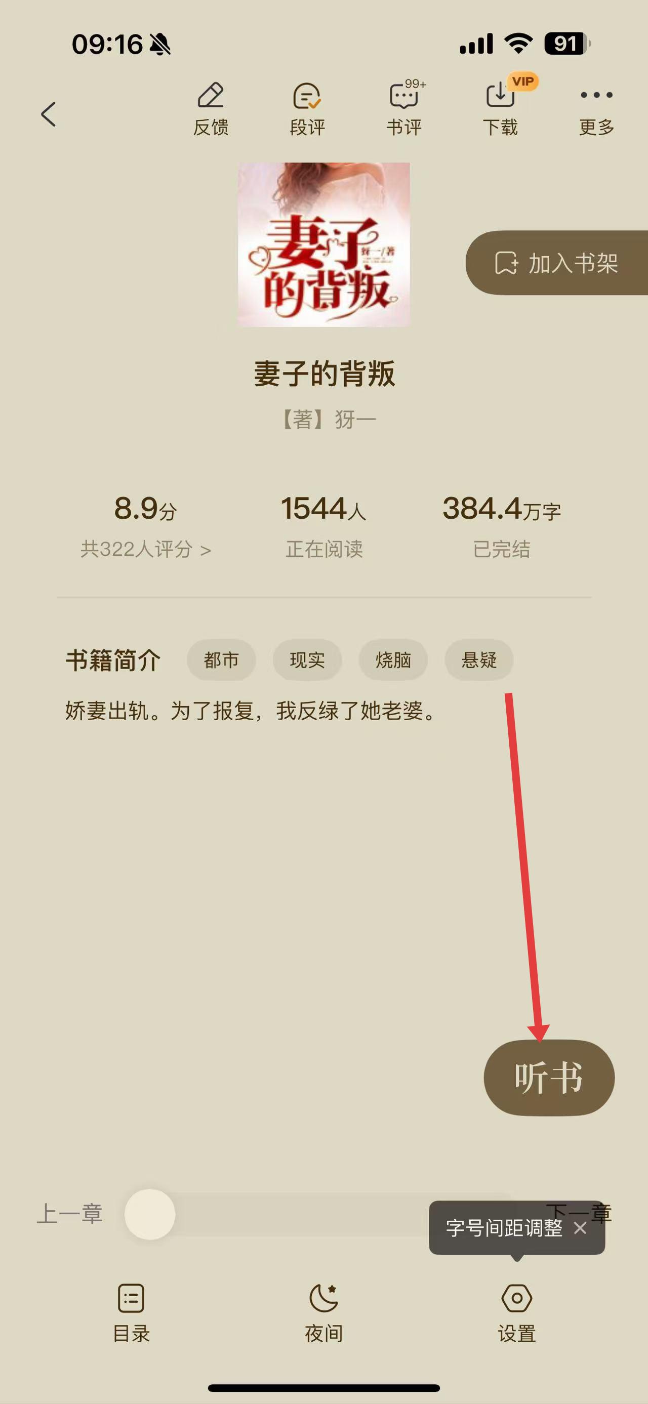 3、進(jìn)入小說(shuō)閱讀界面后,點(diǎn)擊屏幕上的聽(tīng)書按鈕。