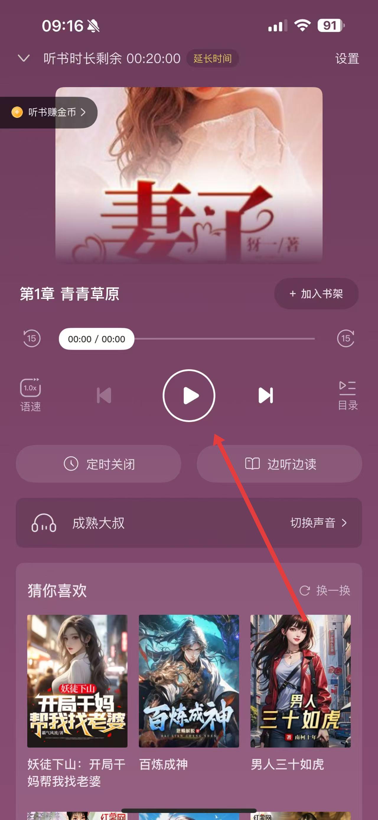 4、在聽(tīng)書界面中,點(diǎn)擊播放按鈕即可開(kāi)始收聽(tīng)小說(shuō)內(nèi)容 。