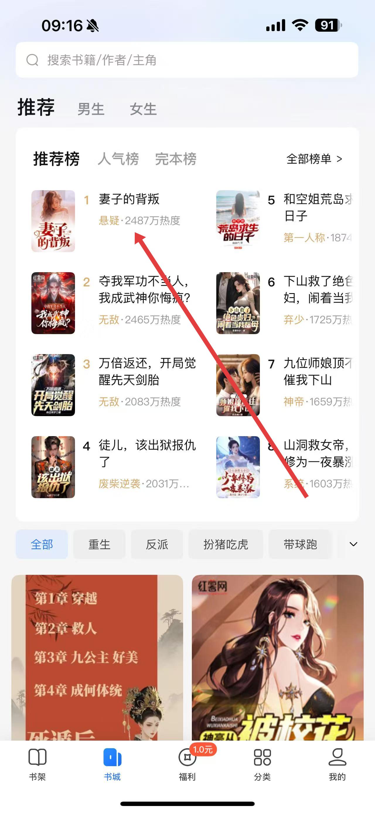 2、在書城的推薦榜單里,選擇一本感興趣的小說(shuō),比如妻子的背叛。