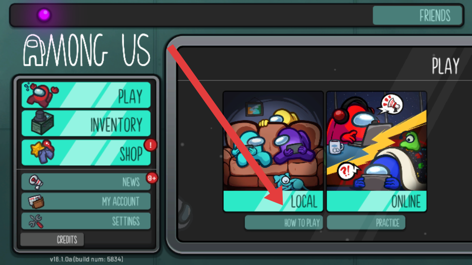 1、啟動(dòng)amongus游戲,進(jìn)入主界面后,在右側(cè)play板塊找到local模式選項(xiàng),點(diǎn)擊它來(lái)創(chuàng)建本地游戲房間,方便和好友聯(lián)機(jī)。